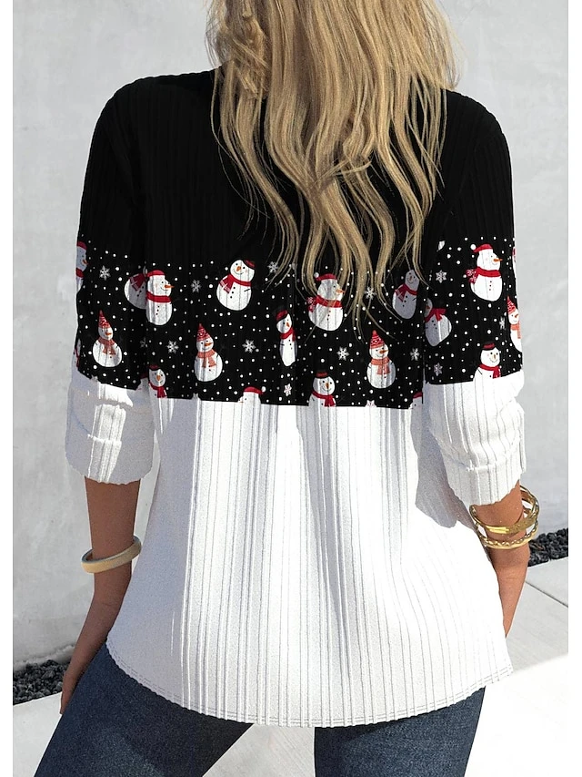 Women’s Blouse Christmas Shirt Black Color Block Snowman Button Print Long Sleeve Christmas Casual Festival / Holiday Shirt Collar Regular Fit Spring &Fall