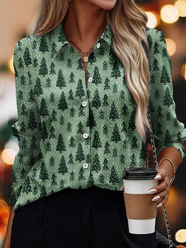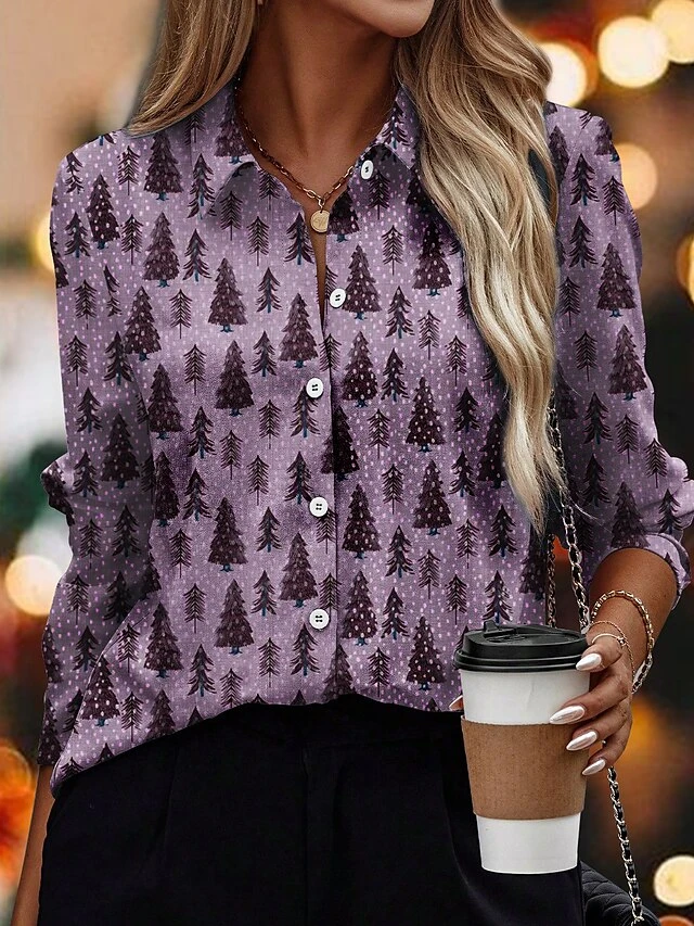 Women’s Blouse Christmas Shirt Blue Purple Green Christmas Tree Button Print Long Sleeve Christmas Casual Festival / Holiday Shirt Collar Regular Fit Spring &Fall
