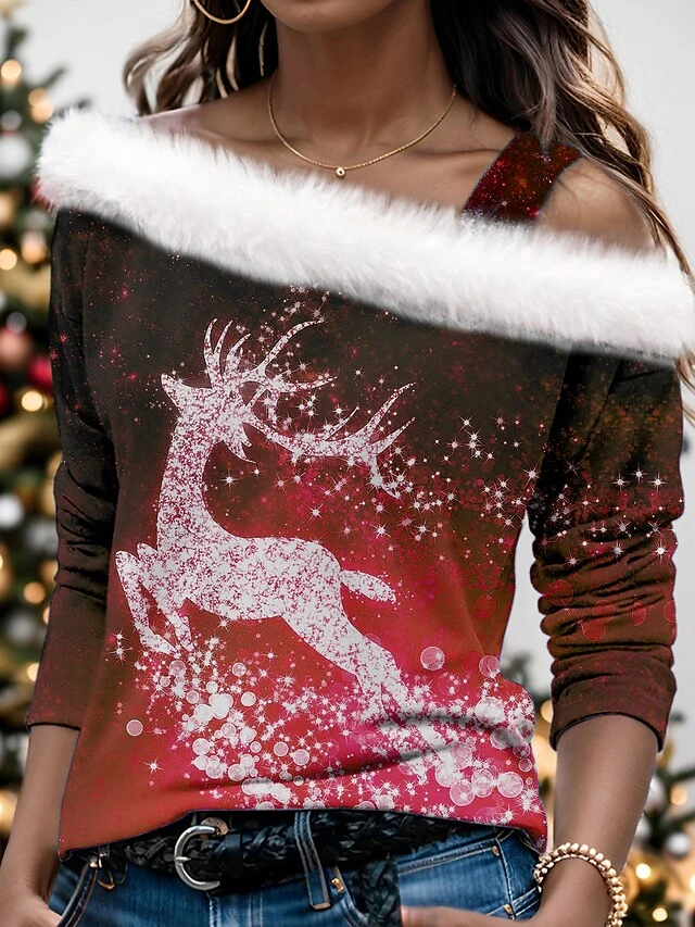 Women’s Blouse Christmas Shirt Pink Red Blue Deer Print Long Sleeve Party Christmas Casual Festival / Holiday Fur Collar Regular Fit Spring &Fall