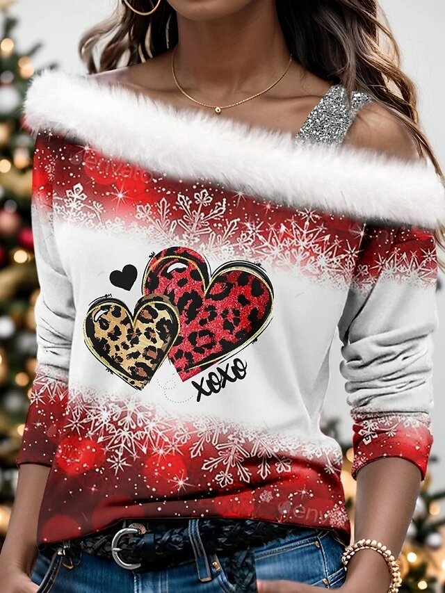 Women’s Blouse Christmas Shirt Red Blue Green Leopard Heart Snowflake Print Long Sleeve Christmas Casual Festival / Holiday Fur Collar Regular Fit Spring &Fall