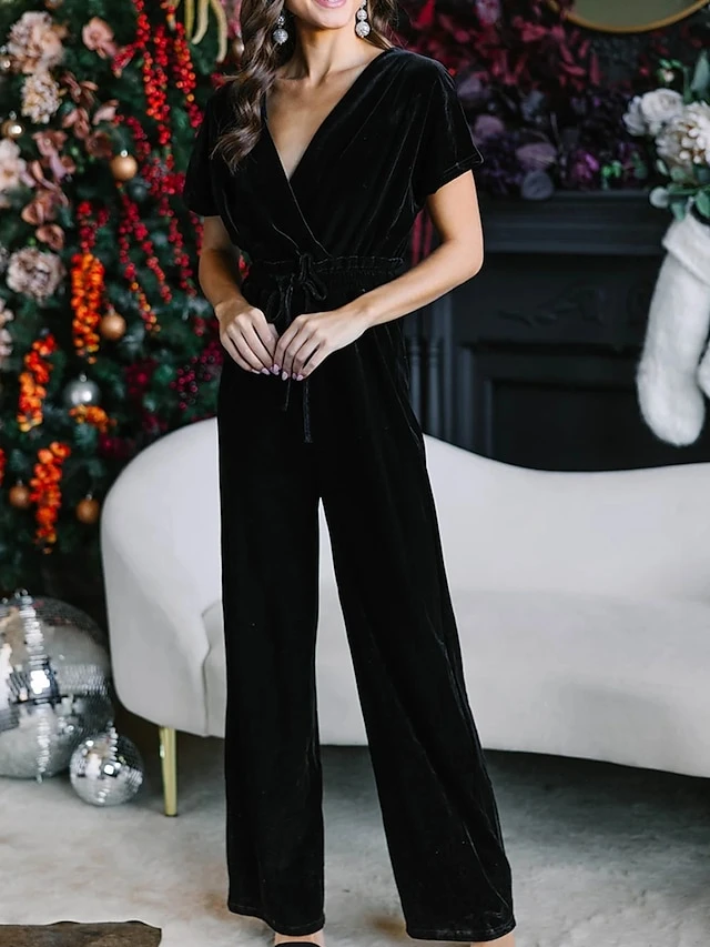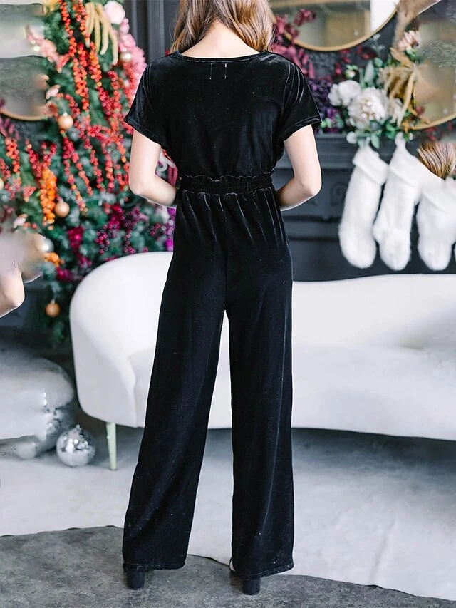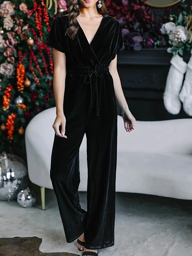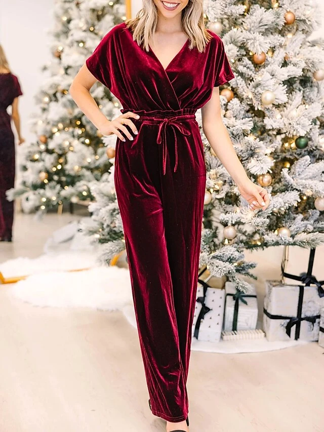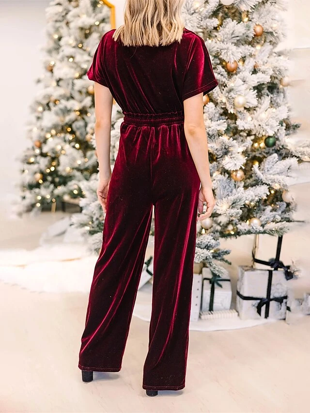 Women’s Jumpsuit Lace Up High Waist Solid Color Round Neck Active Christmas Daily Regular Fit Short Sleeve Black Wine Green S M L Fall