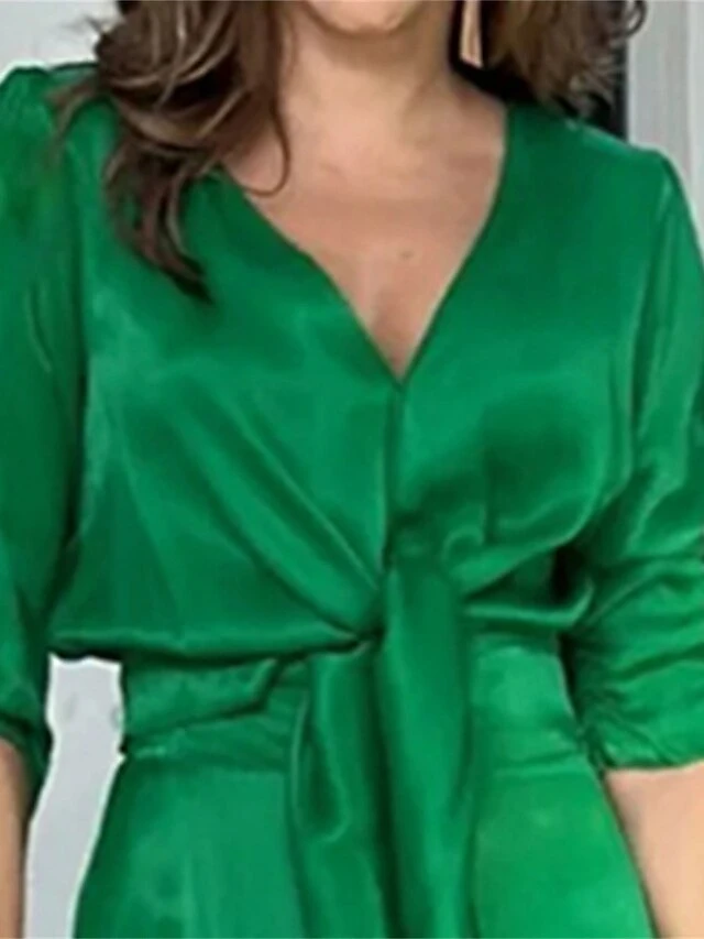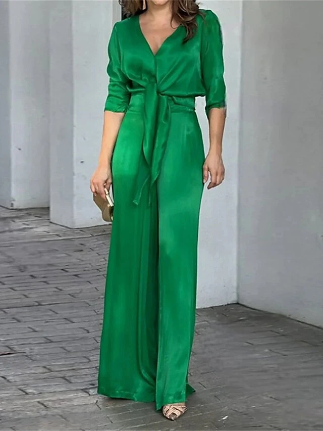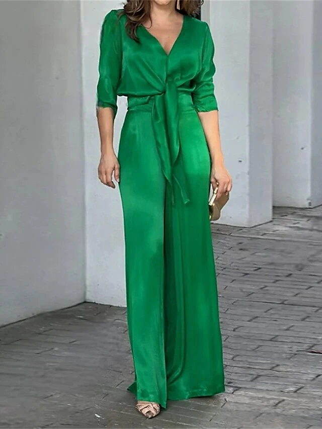 Women’s Jumpsuit Lace Up High Waist Solid Color V Neck Business Office Work Xmas Party Christmas Regular Fit Long Sleeve Green S M L Summer