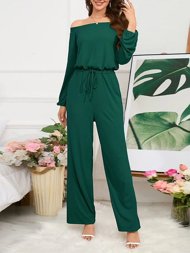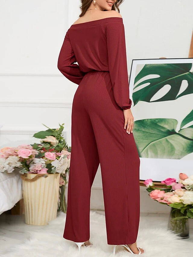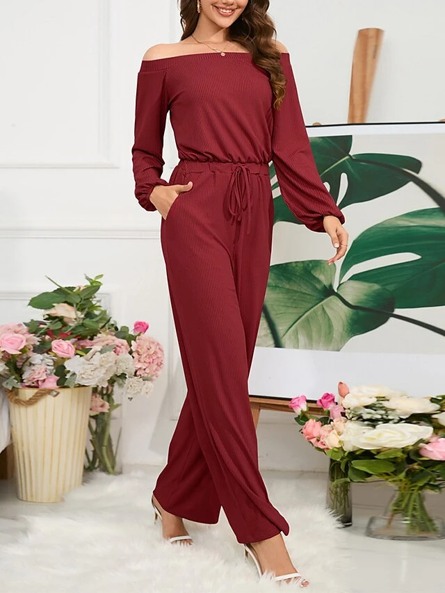 Women’s Jumpsuit Pocket Drawstring Solid Color Off Shoulder Christmas Business Office Work Xmas Regular Fit Long Sleeve Black Red Blue S M L Fall
