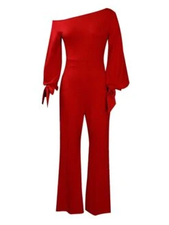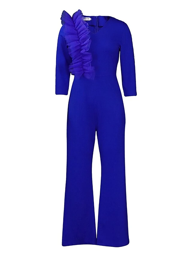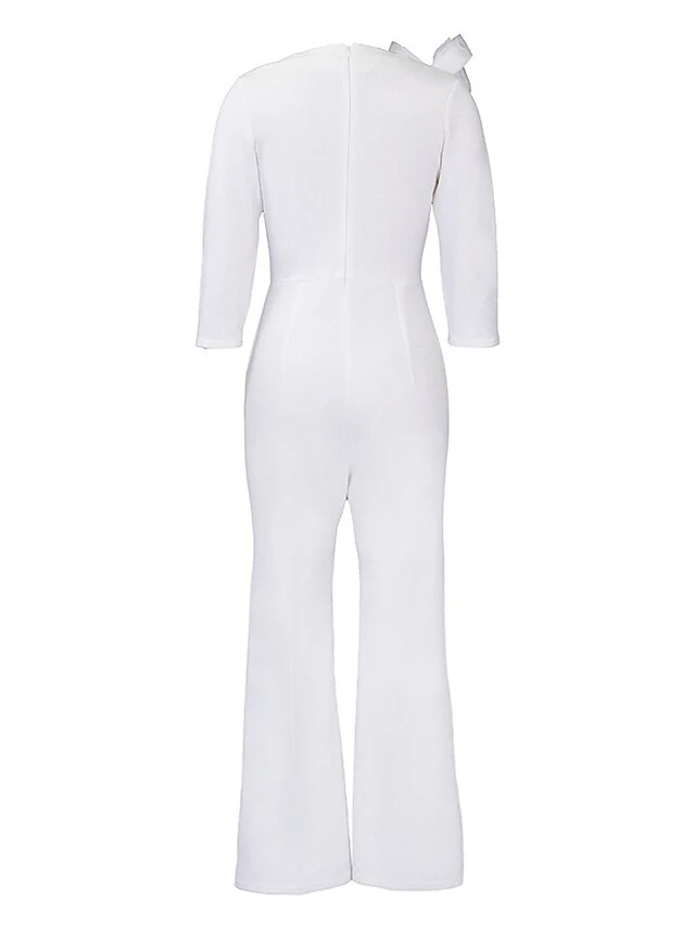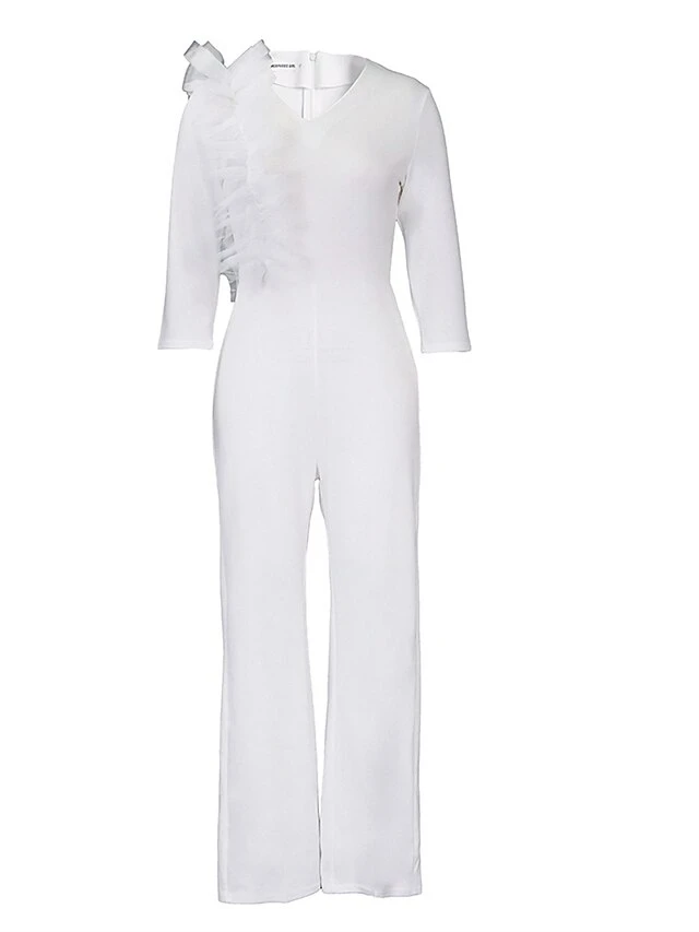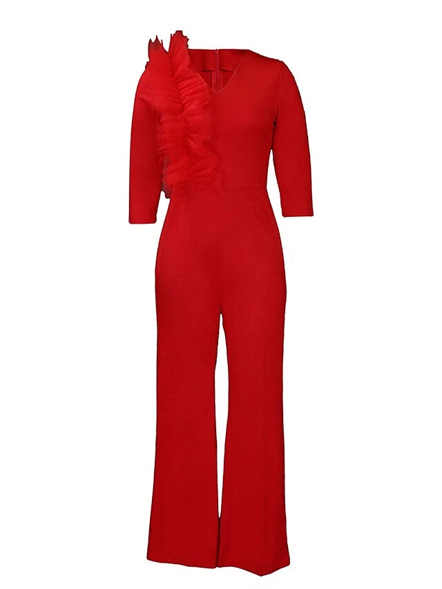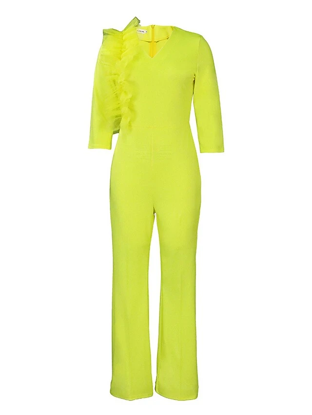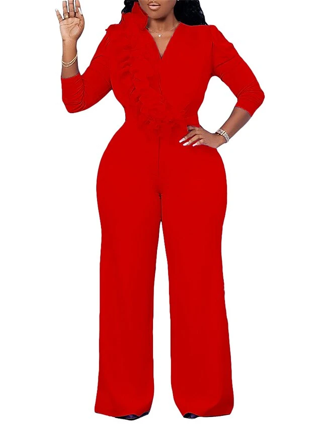 Women’s Jumpsuit Ruffle High Waist Solid Color V Neck Christmas Business Office Work Xmas Regular Fit Long Sleeve White Yellow Red S M L Fall