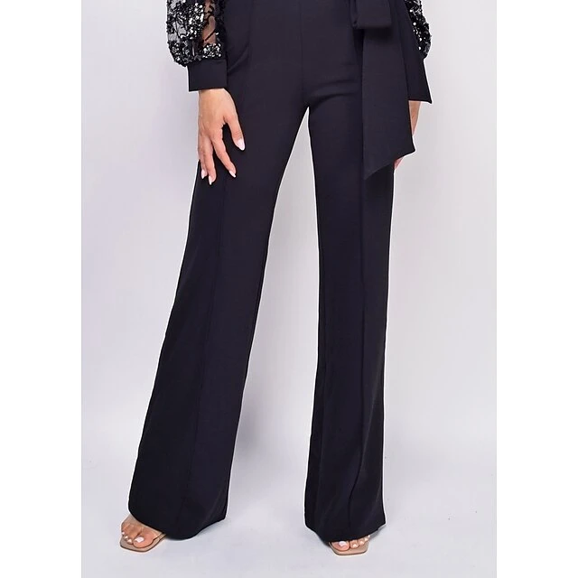 Women‘s Jumpsuit Solid Color Deep V Sequin Xmas Wedding Elegant Daily Holiday Christmas Straight Regular Fit Long Sleeve Black 3XL Spring