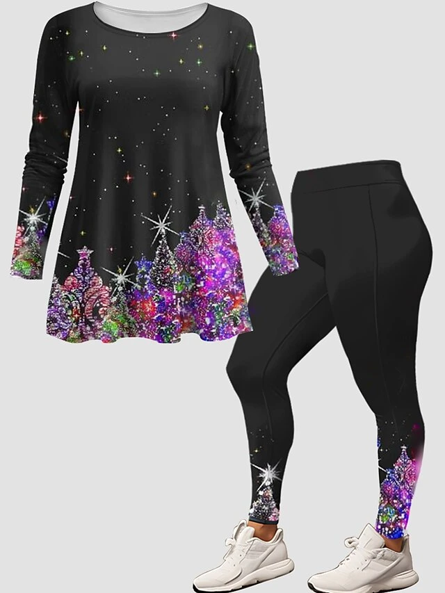 Women’s Pants Sets Christmas Shirt Black Blue Purple Graphic Sparkly Print Long Sleeve Casual Festival Christmas Round Neck Regular Fit Spring &Fall