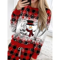 Women’s Pants Sets Christmas Shirt Blue Purple Brown Reindeer Print Long Sleeve Party Christmas Festival Christmas Round Neck Regular Fit Spring &Fall