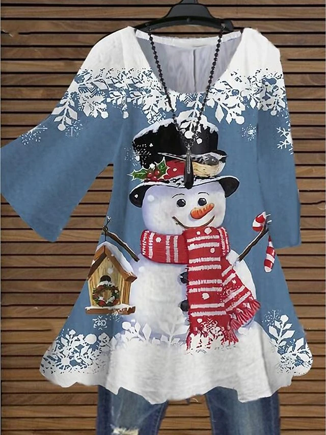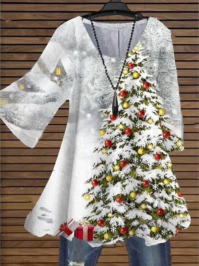 Women‘s Plus Size Christmas Tops Blouse Graphic Christmas Tree Print 3/4 Length Sleeve Streetwear Holiday Party Polyester Winter Fall Blue White