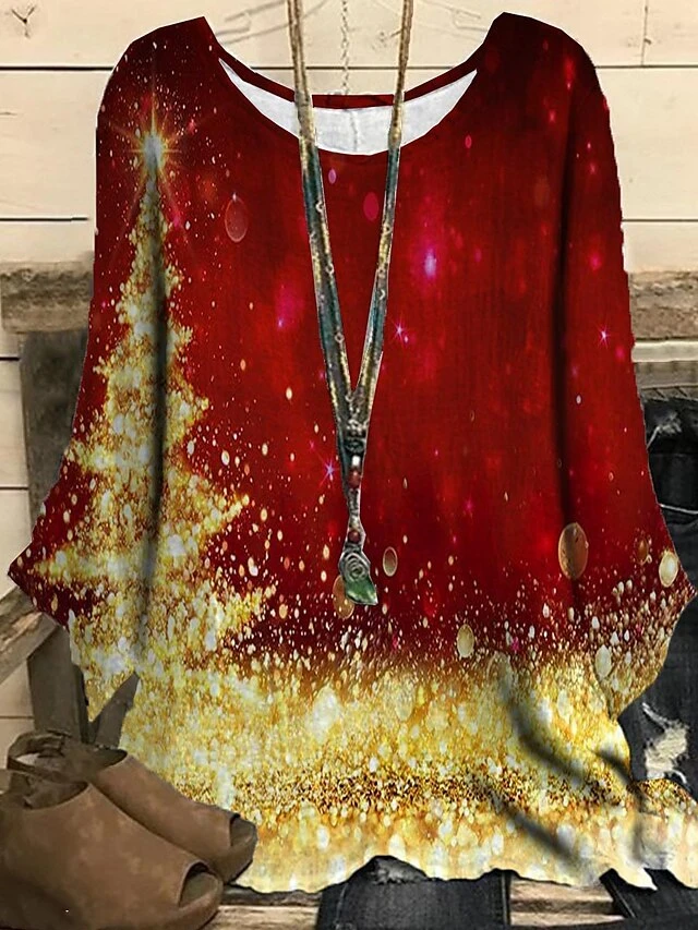 Women‘s Plus Size Christmas Tops Blouse Shirt Tree Sunflower Print Long Sleeve Crewneck Casual Daily Polyester Winter Fall Green Dark Green