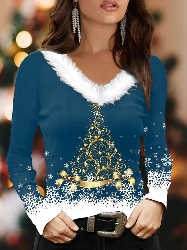 Women’s Shirt Blouse Christmas Shirt Black Red Blue Christmas Tree Snowflake Print Long Sleeve Party Christmas Casual Festival / Holiday Print Fur Collar V Neck Regular Fit Fall & Winter