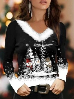Women’s Shirt Blouse Christmas Shirt Black Red Blue Snowman Christmas Tree Snowflake Print Long Sleeve Party Christmas Casual Festival / Holiday Print Fur Collar V Neck Regular Fit Fall & Winter