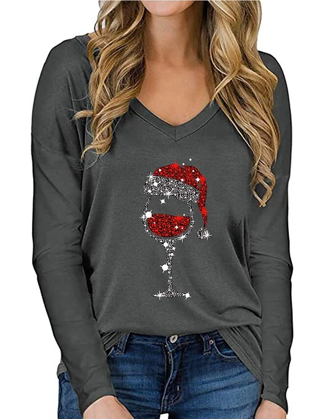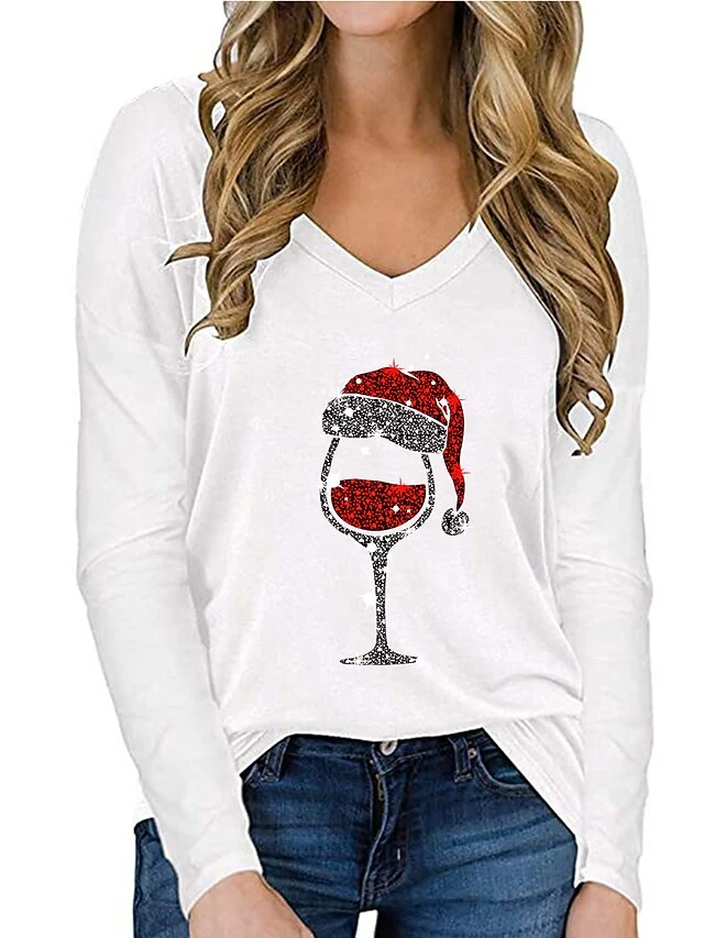 Women’s Shirt Blouse Christmas Shirt Black White Army Green Beer Patchwork Long Sleeve Christmas Casual Casual Christmas V Neck Loose Fit Bell Sleeve Spring Fall