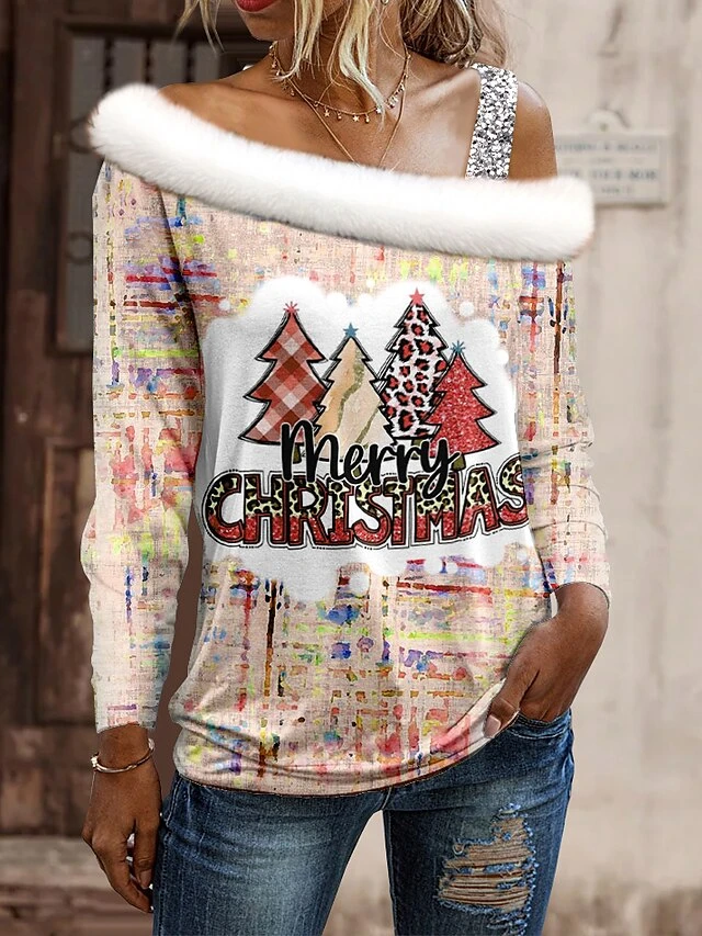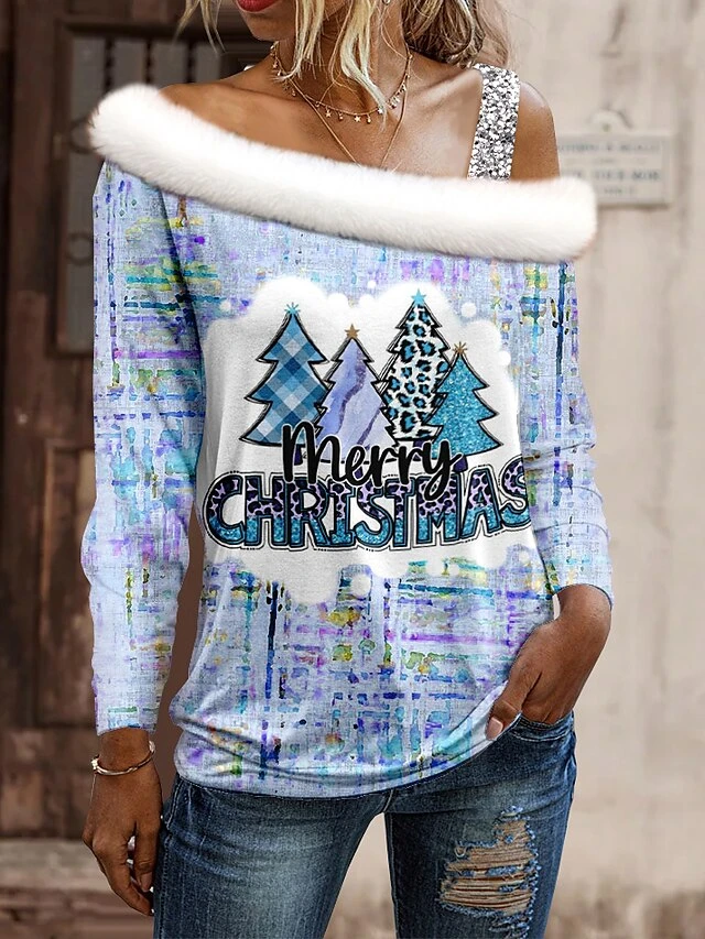 Women’s Shirt Blouse Christmas Shirt Yellow Pink Blue Leopard Christmas Tree Print Long Sleeve Party Christmas Casual Festival / Holiday One Shoulder Fur Collar Regular Fit Spring &Fall
