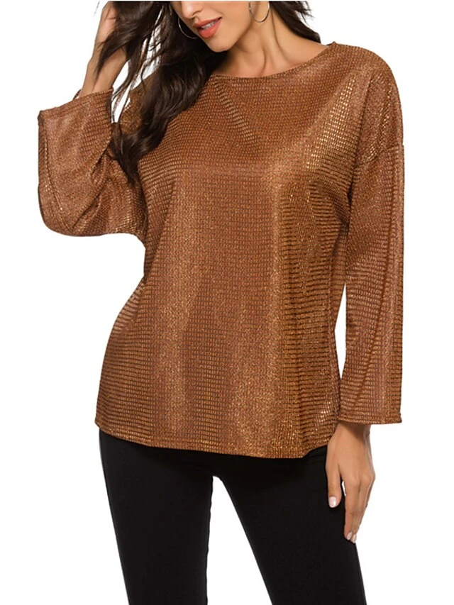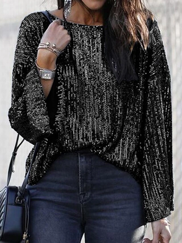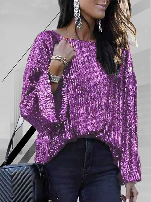 Women’s Shirt Blouse Fleece Black Wine Purple Plain Sparkly Sequins Long Sleeve Party Christmas Casual Vintage Fashion Metallic Round Neck Regular Fit Spring Fall