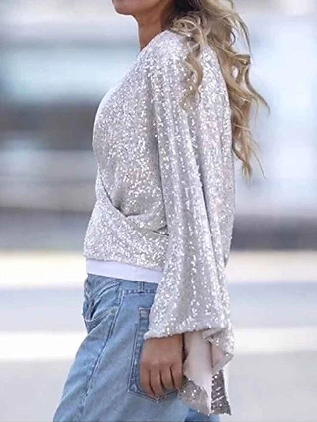 Women’s Shirt Blouse White Sparkly Sequins Long Sleeve Party Christmas Fashion V Neck Regular Fit Bell Sleeve Spring &Fall