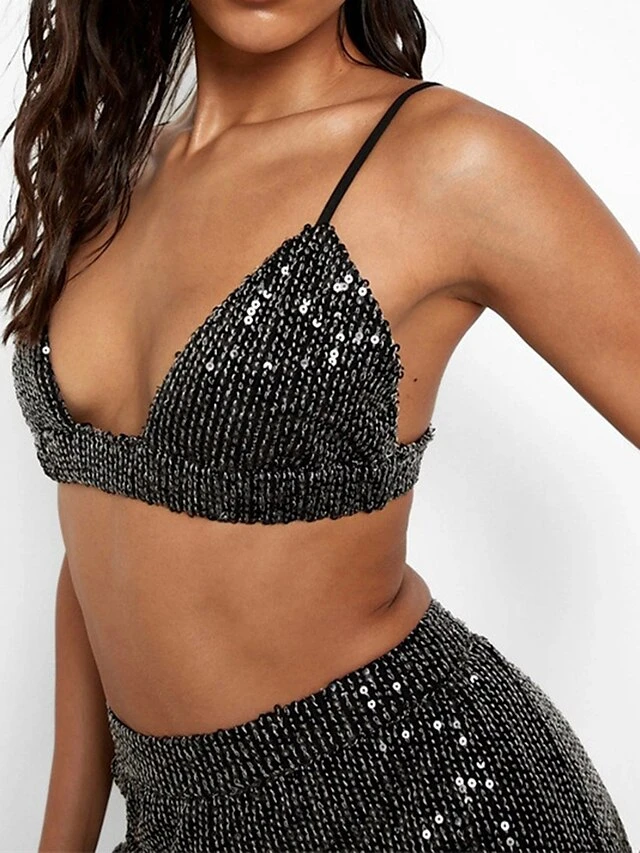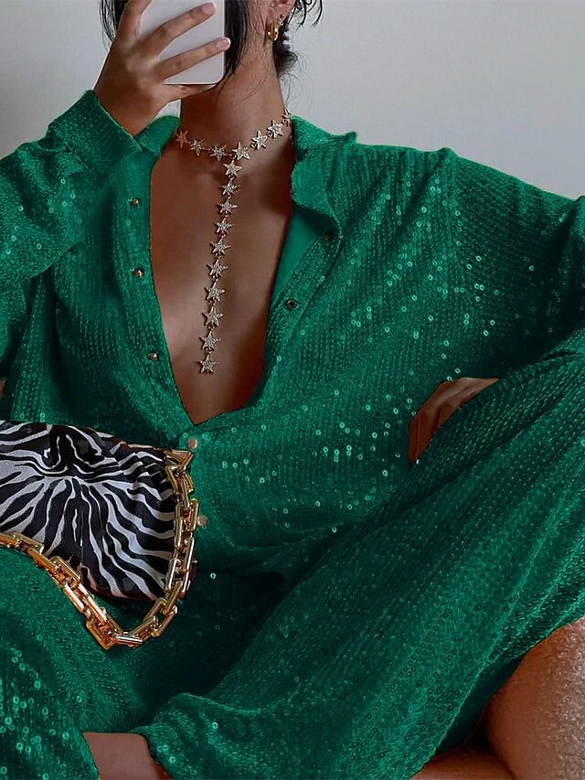 Women’s Shirt Bra Pants Sets Black Red Green Sparkly Sequins Long Sleeve Party Christmas Metallic Shirt Collar Regular Fit Spring &Fall