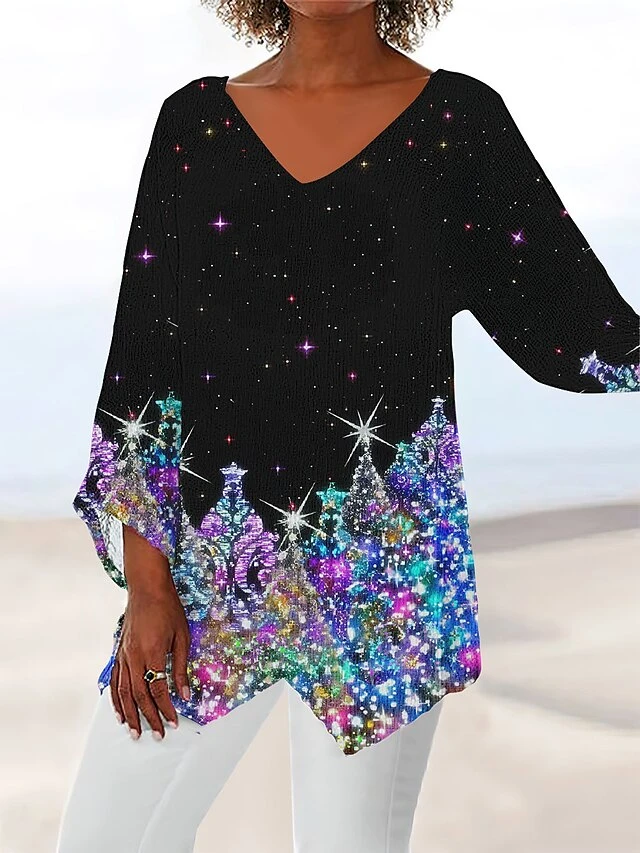 Women’s Shirt Christmas Shirt Black White Red Star Christmas Tree Snowflake Print Long Sleeve Christmas Weekend Streetwear Casual V Neck Regular Fit