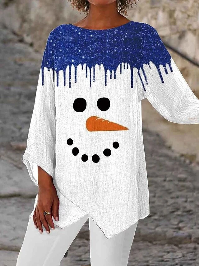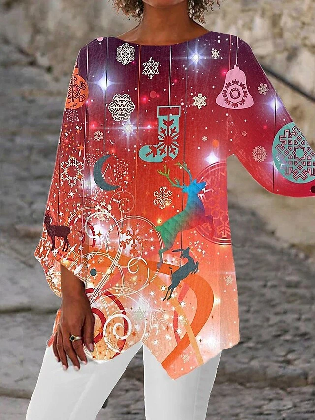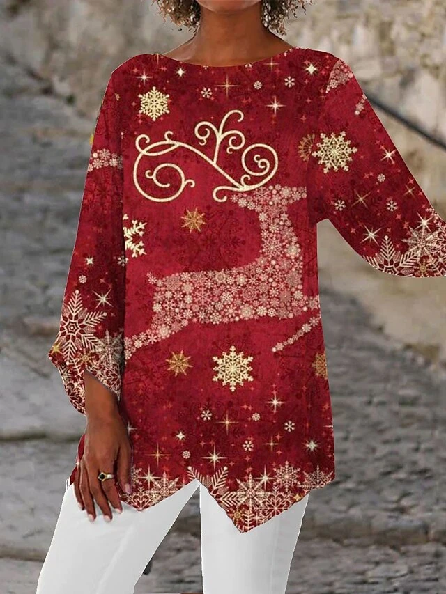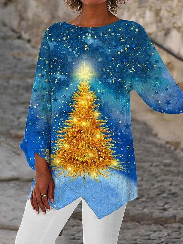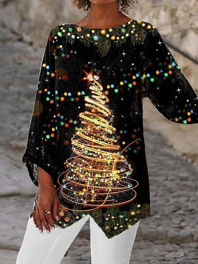 Women’s Shirt Christmas Shirt Black White Yellow Christmas Tree Deer Asymmetric Print Long Sleeve Christmas Weekend Streetwear Christmas Round Neck Regular Fit