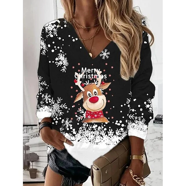 Women’s Shirt Christmas Shirt Black Wine Red Snowflake Print Long Sleeve Christmas Weekend Streetwear Casual V Neck Regular Fit Spring Fall