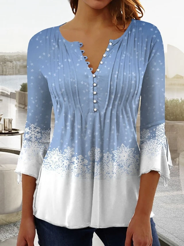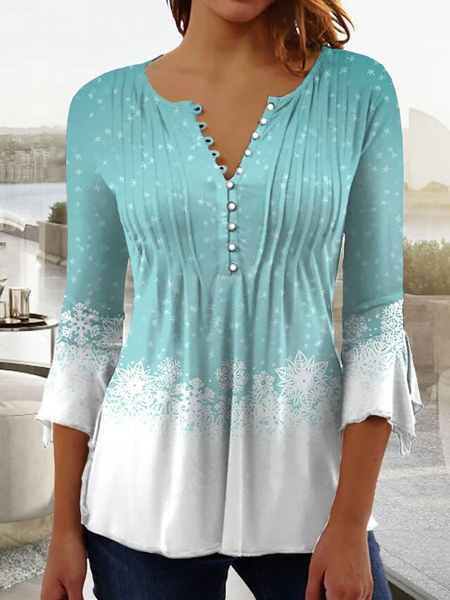 Women’s Shirt Christmas Shirt Pink Blue Purple Snowflake Button Print 3/4 Length Sleeve Christmas Weekend Streetwear Casual Round Neck Regular Fit