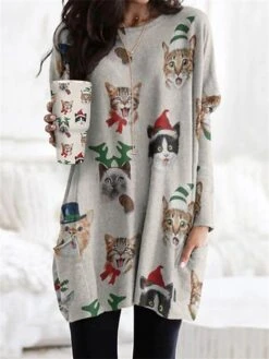 Women’s Shirt Christmas Shirt Red Blue Green Cat Santa Claus Snowflake Pocket Print Long Sleeve Christmas Weekend Streetwear Christmas Round Neck Regular Fit Spring Fall