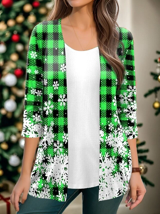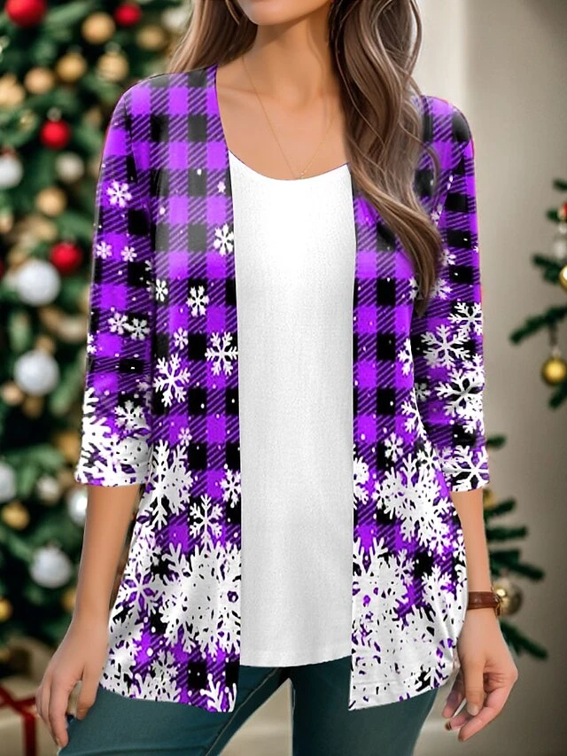 Women’s Shirt Shrugs Christmas Shirt Pink Red Blue Plaid Snowflake Print 3/4 Length Sleeve Party Christmas Casual Festival / Holiday V Neck Regular Fit Spring &Fall