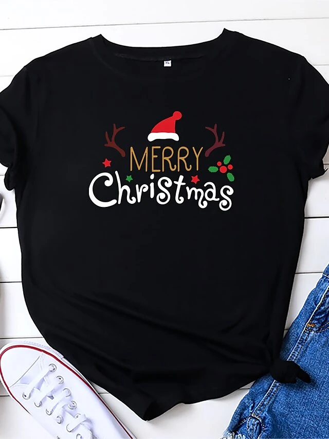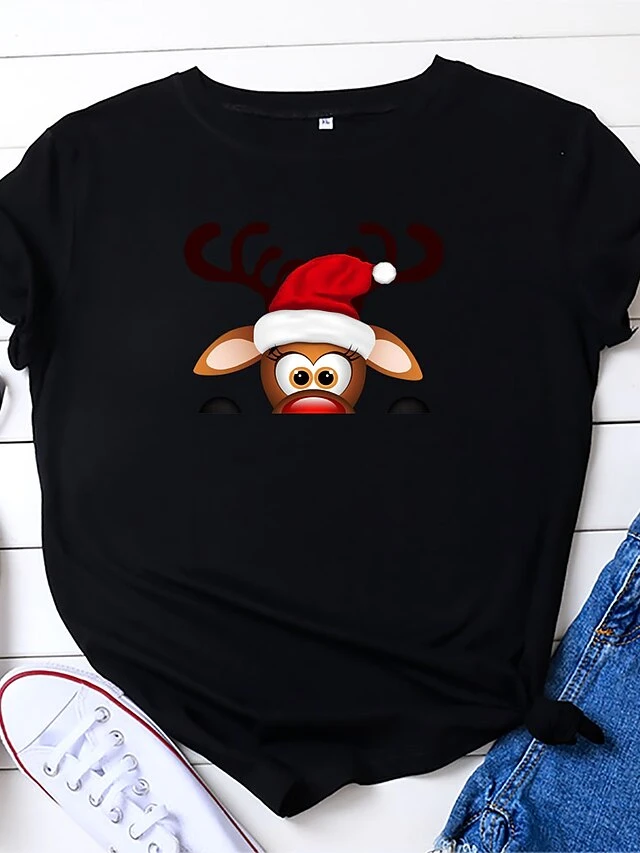 Women’s T Shirt Tee Christmas Shirt 100% Cotton Black Red Brown Leopard Christmas Tree Reindeer Print Short Sleeve Christmas Gift Casual Basic Christmas Round Neck Regular Fit Painting