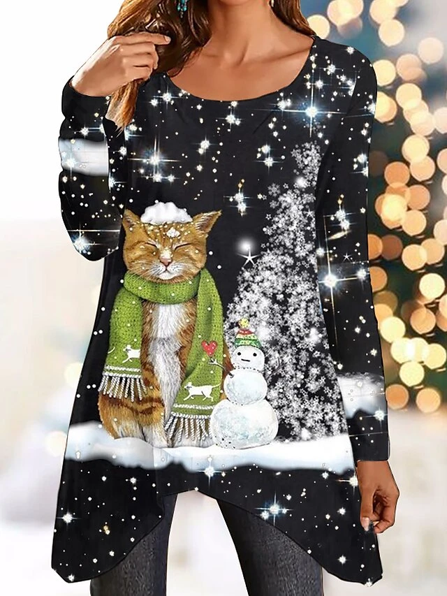 Women’s T Shirt Tee Christmas Shirt Black Cat Snowman Flowing Tunic Print Long Sleeve Christmas Weekend Basic Print Christmas Round Neck Regular Fit Painting Fall & Winter