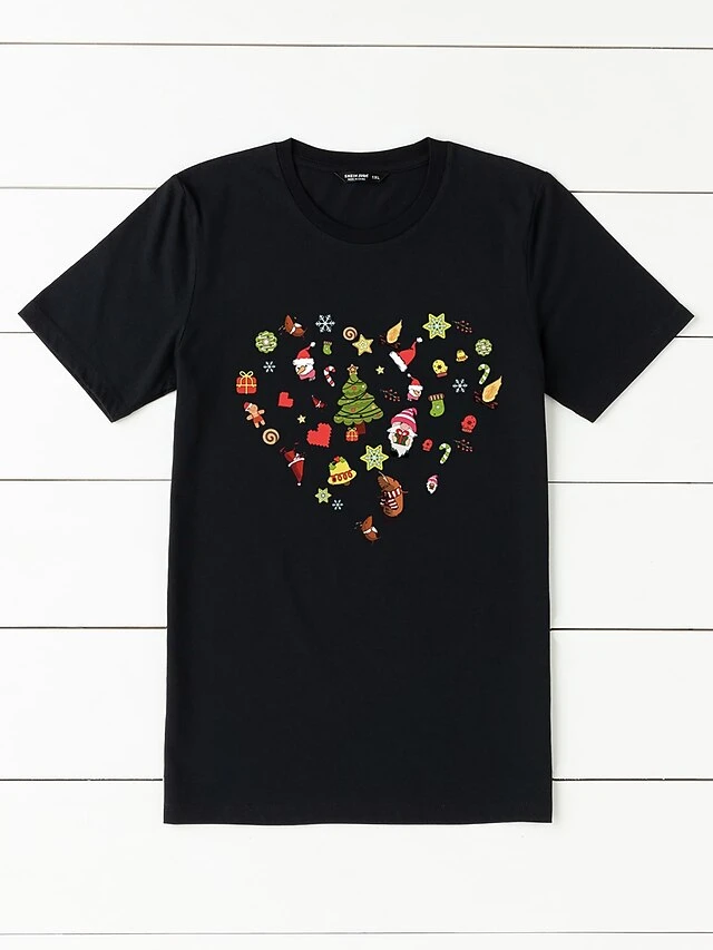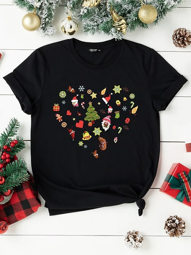 Women’s T Shirt Tee Christmas Shirt Black Graphic Heart Print Short Sleeve Christmas Weekend Festival / Holiday Christmas Round Neck Regular Fit Painting Spring &Fall