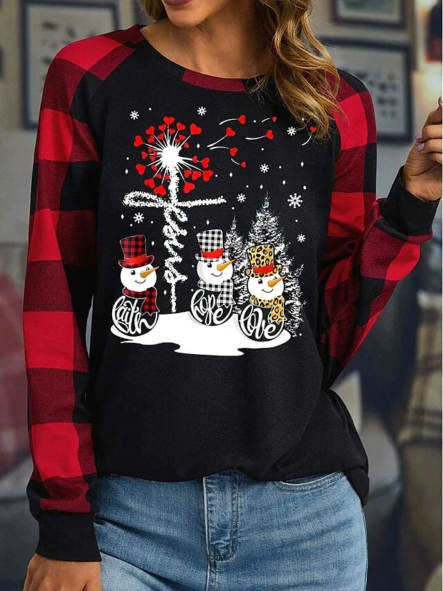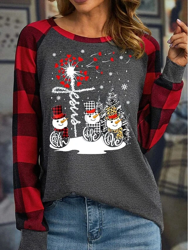 Women’s T Shirt Tee Christmas Shirt Black Light Grey Dark Gray Plaid Snowman Print Long Sleeve Christmas Weekend Festival / Holiday Round Neck Regular Fit Painting Spring &Fall