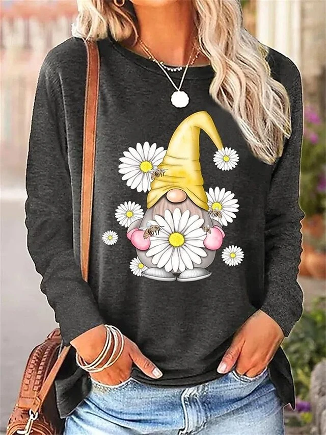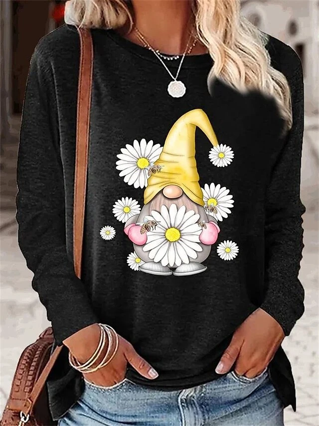 Women’s T Shirt Tee Christmas Shirt Black Pink Blue Floral Santa’s Helper Print Long Sleeve Christmas Weekend Festival / Holiday Round Neck Regular Fit Painting Spring &Fall