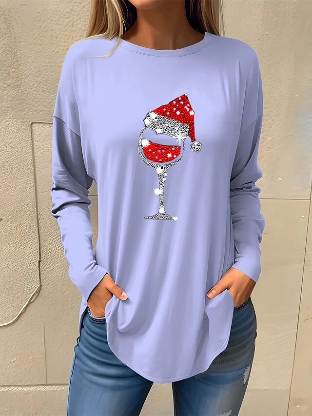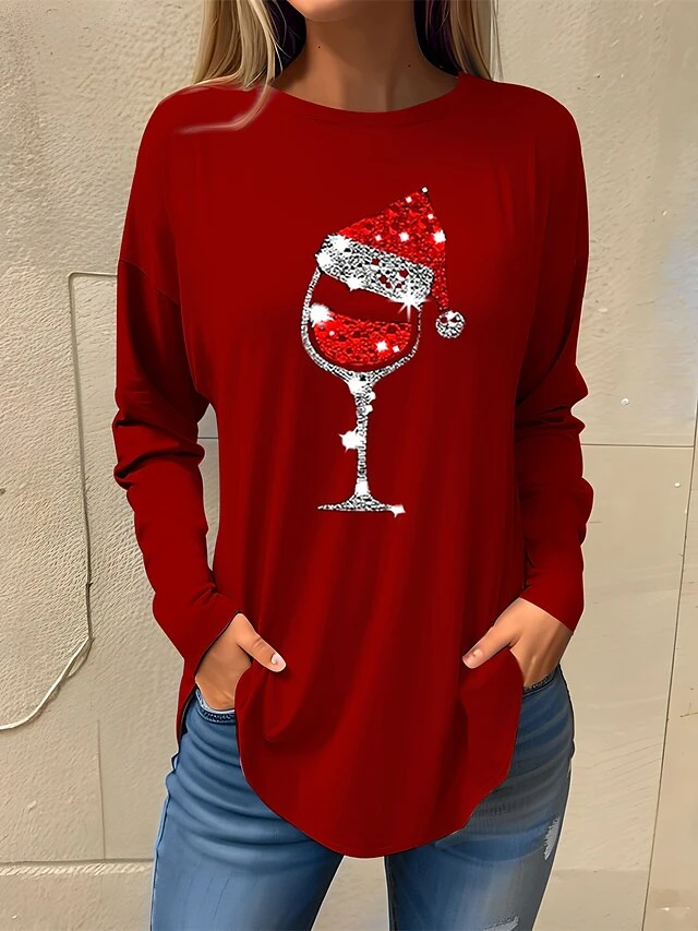 Women’s T Shirt Tee Christmas Shirt Black Pink Red Wine Glass Rhinestone Print Long Sleeve Party Christmas Weekend Festival / Holiday Christmas Round Neck Regular Fit Painting Spring &Fall