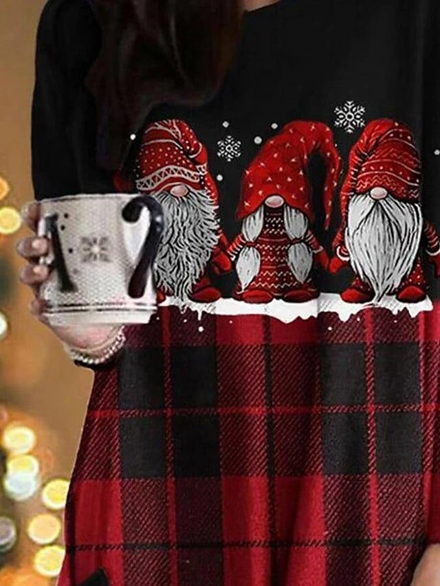 Women’s T Shirt Tee Christmas Shirt Black Plaid Santa’s Helper Pocket Print Long Sleeve Christmas Weekend Festival / Holiday Round Neck Regular Fit Painting Spring &Fall