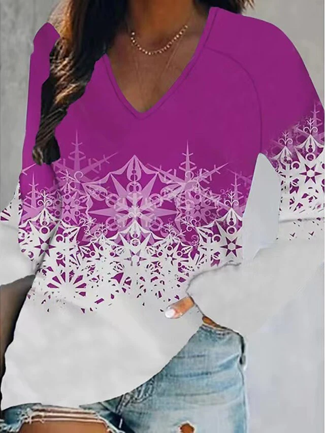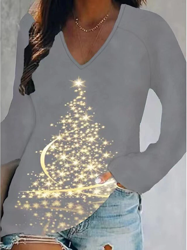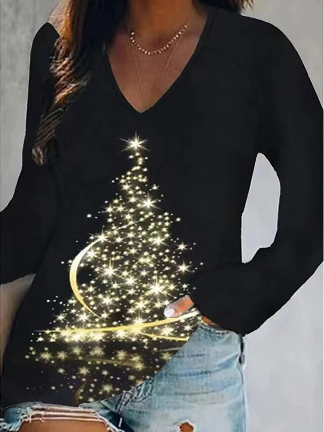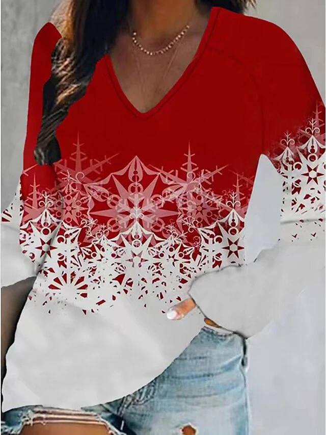 Women’s T Shirt Tee Christmas Shirt Black Red Blue Christmas Tree Snowflake Print Long Sleeve Christmas Weekend Basic Christmas V Neck Regular Fit Floral Painting Fall & Winter