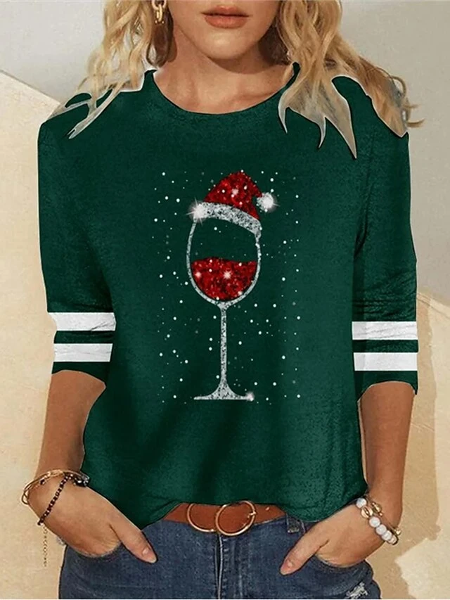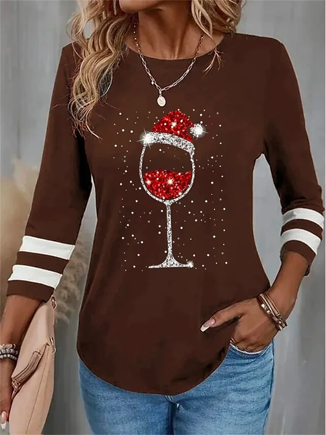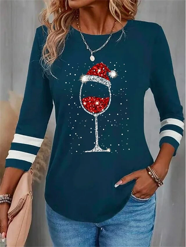 Women’s T Shirt Tee Christmas Shirt Black Red Blue Wine Glass Rhinestone Print Long Sleeve Christmas Weekend Festival / Holiday Round Neck Regular Fit Painting Spring &Fall