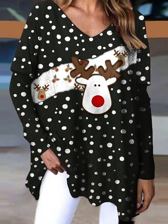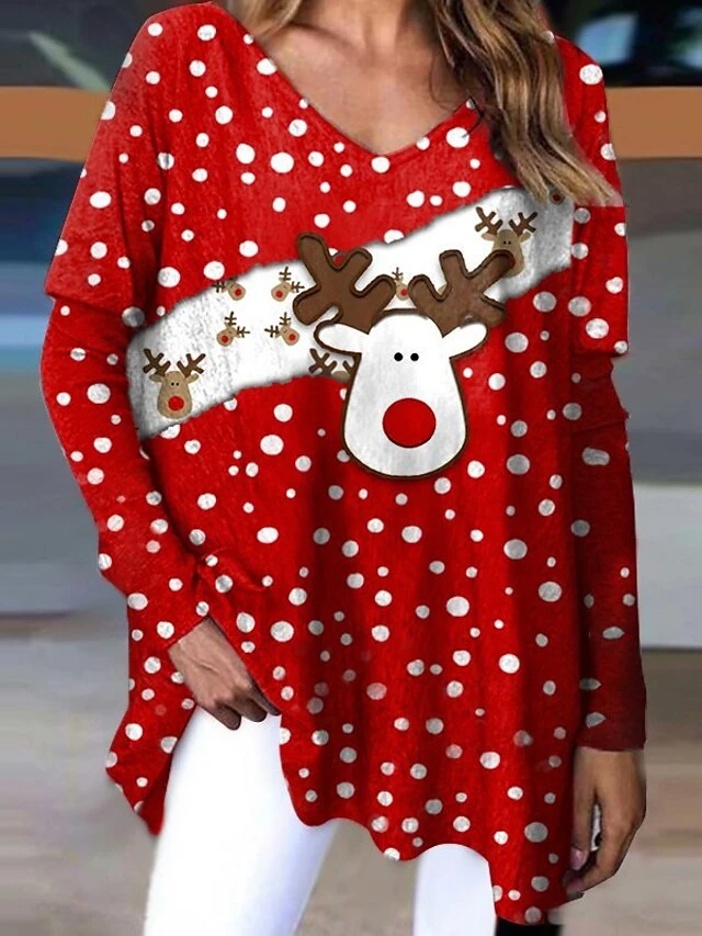Women’s T Shirt Tee Christmas Shirt Black Red Green Polka Dot Reindeer Print Long Sleeve Christmas Weekend Festival / Holiday V Neck Regular Fit Painting Spring &Fall