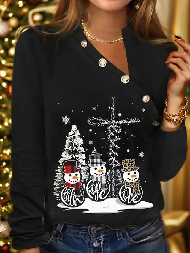 Women’s T Shirt Tee Christmas Shirt Black Snowman Button Print Long Sleeve Christmas Weekend Festival / Holiday Christmas V Neck Regular Fit Painting Spring &Fall
