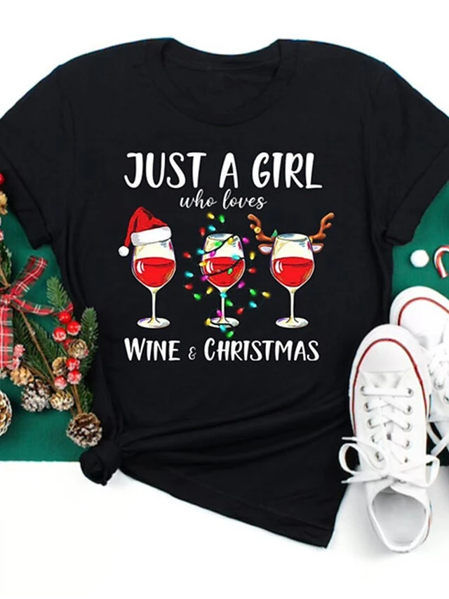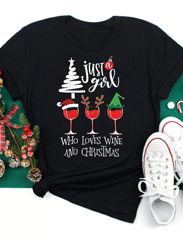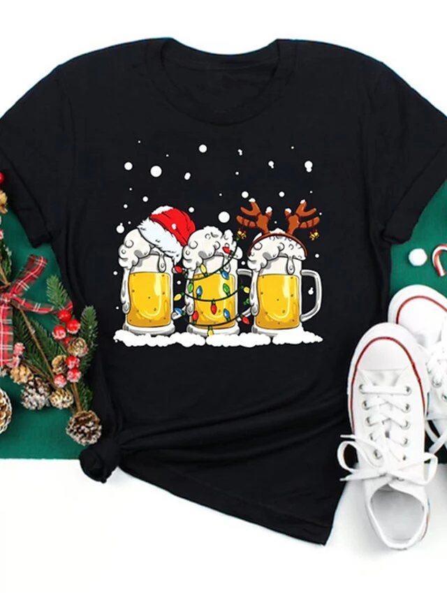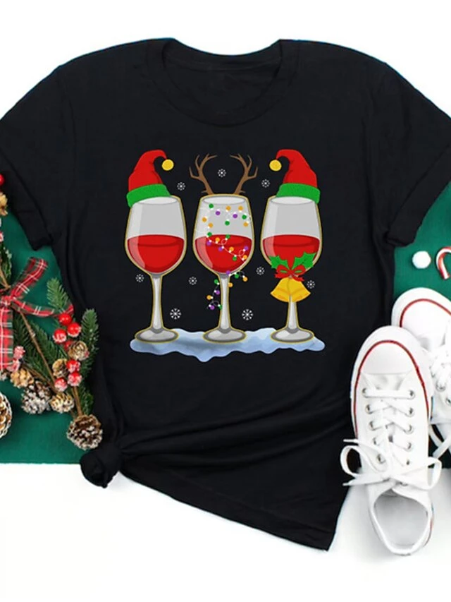 Women’s T Shirt Tee Christmas Shirt Black Yellow Red Christmas Tree Reindeer Print Short Sleeve Christmas Gift Casual Basic Christmas Round Neck Regular Fit Painting