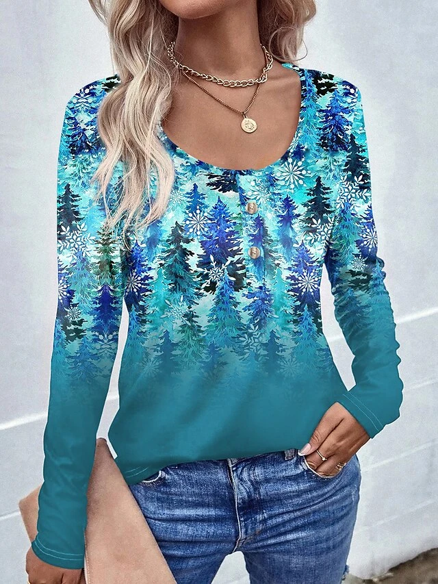 Women’s T Shirt Tee Christmas Shirt Blue Christmas Tree Snowflake Button Print Long Sleeve Christmas Weekend Festival / Holiday Round Neck Regular Fit Painting Spring &Fall