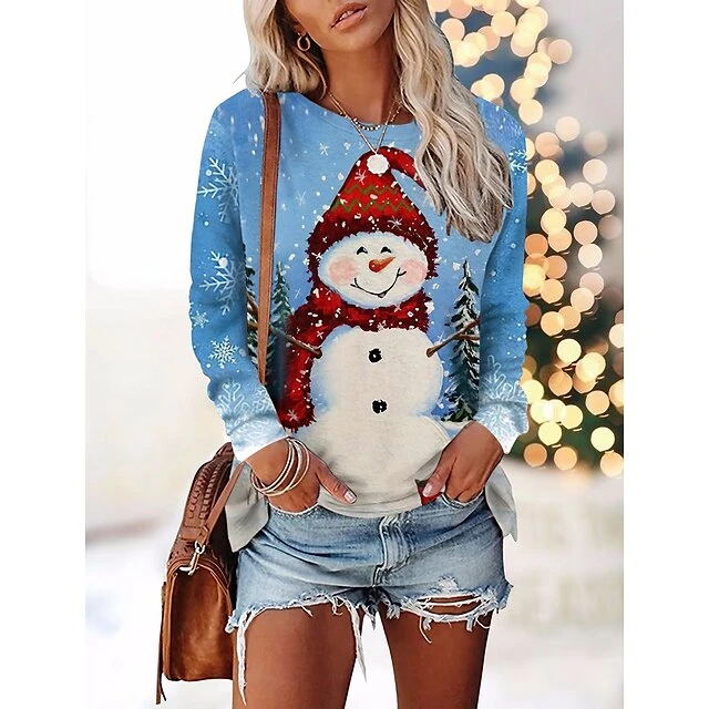 Women’s T Shirt Tee Christmas Shirt Blue Snowman Print Long Sleeve Christmas Weekend Basic Christmas Round Neck Regular Fit Painting