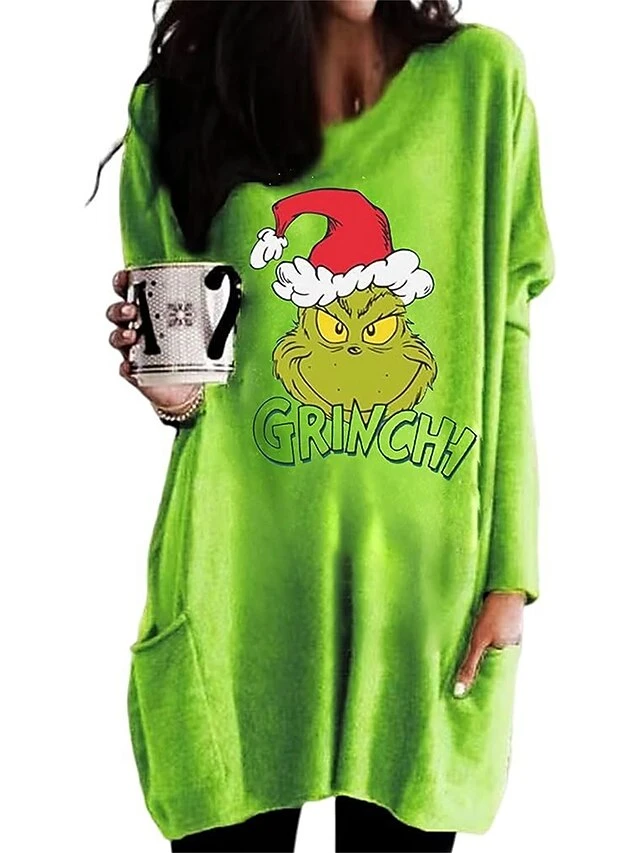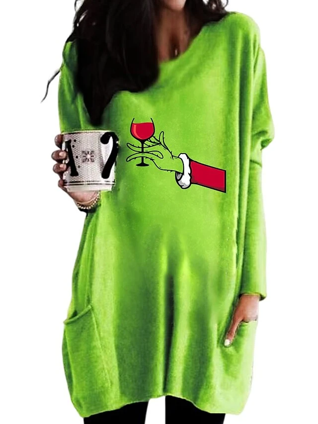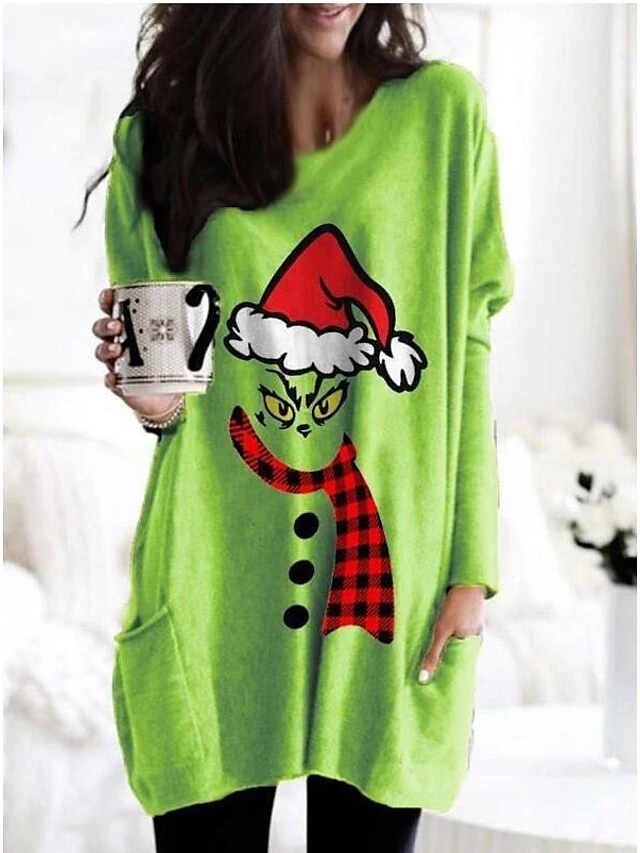 Women’s T Shirt Tee Christmas Shirt Grass Green Light Green Army Green Graphic Ugly Christmas Monster Pocket Print Long Sleeve Christmas Weekend Festival / Holiday Christmas V Neck Regular Fit