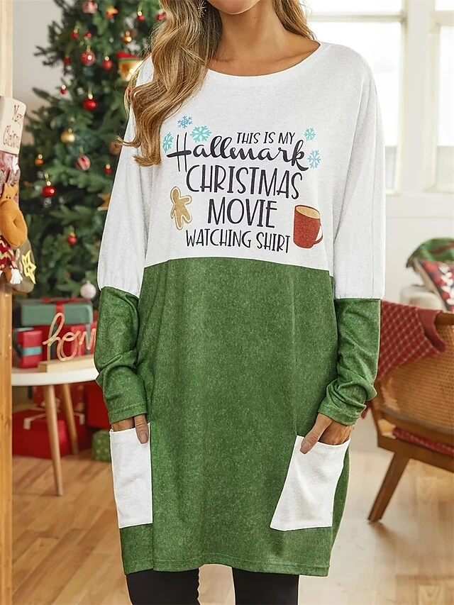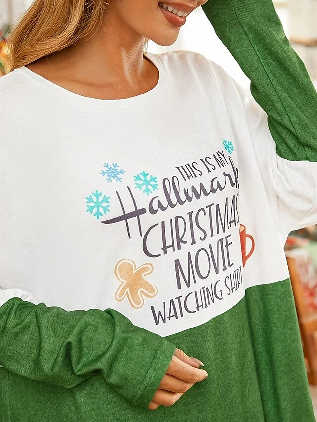 Women’s T Shirt Tee Christmas Shirt Green Color Block Letter Pocket Print Long Sleeve Christmas Weekend Festival / Holiday Christmas Round Neck Regular Fit Painting Spring &Fall
