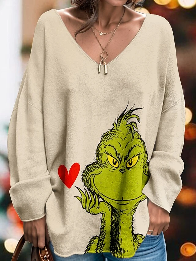 Women’s T Shirt Tee Christmas Shirt Khaki Graphic Ugly Christmas Print Long Sleeve Christmas Weekend Festival / Holiday V Neck Regular Fit Painting Spring &Fall