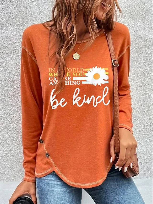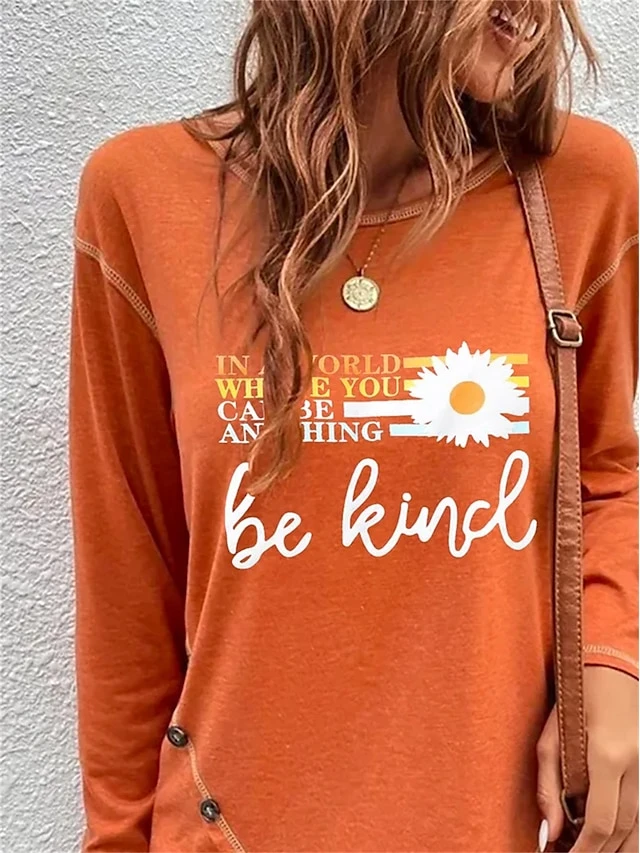 Women’s T Shirt Tee Christmas Shirt Orange Floral Letter Print Long Sleeve Holiday Weekend Basic Christmas Round Neck Regular Fit Floral Painting Spring &Fall