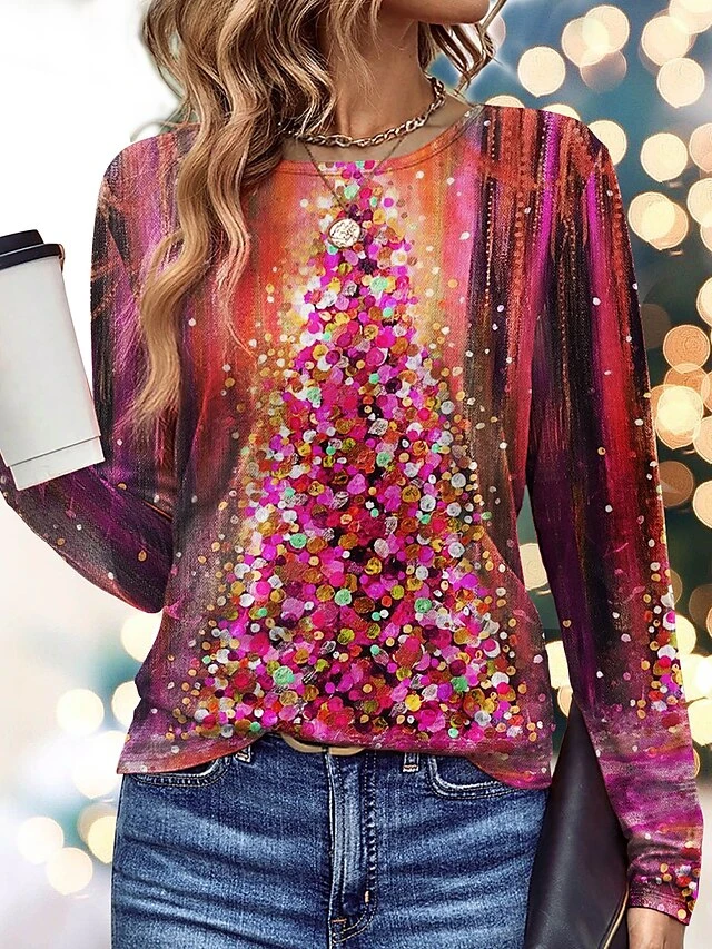 Women’s T Shirt Tee Christmas Shirt Pink Blue Orange Christmas Tree Print Long Sleeve Party Christmas Weekend Festival / Holiday Round Neck Regular Fit Painting Spring &Fall