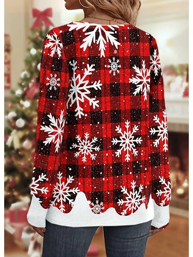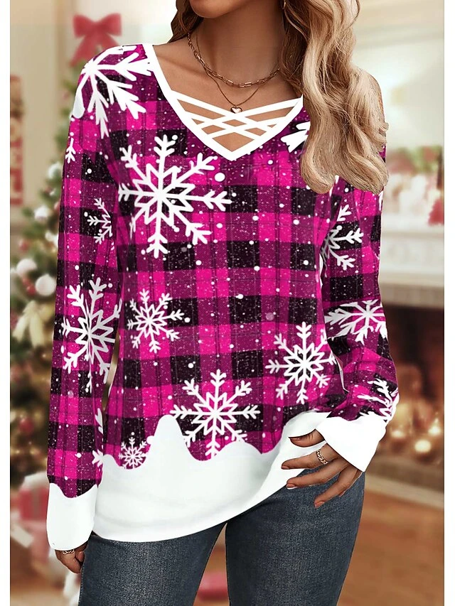 Women’s T Shirt Tee Christmas Shirt Pink Red Blue Plaid Snowflake Print Long Sleeve Christmas Weekend Festival / Holiday V Neck Regular Fit Painting Spring &Fall