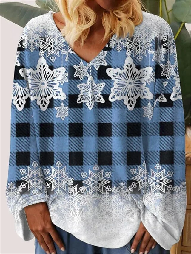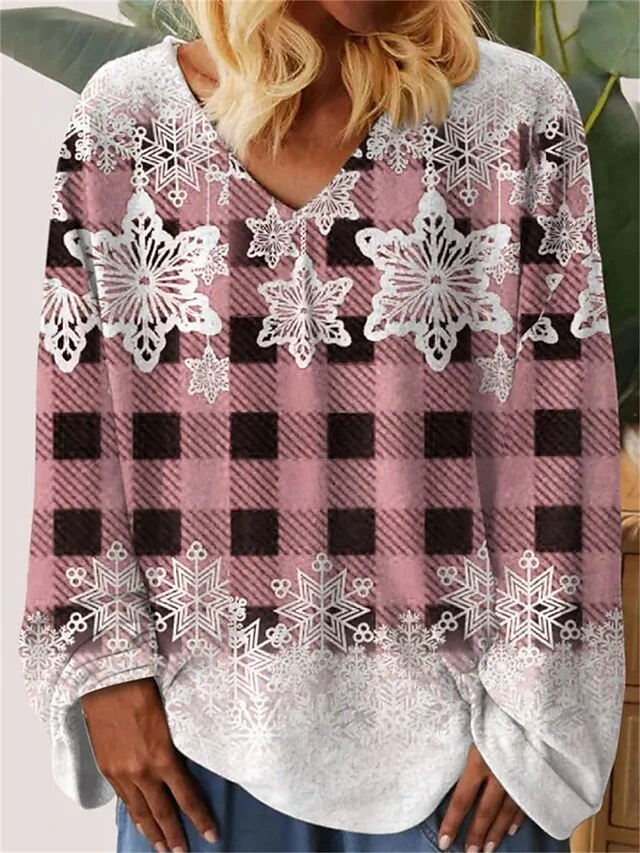 Women’s T Shirt Tee Christmas Shirt Pink Red Blue Plaid Snowflake Print Long Sleeve Party Christmas Weekend Festival / Holiday V Neck Regular Fit Painting Spring &Fall