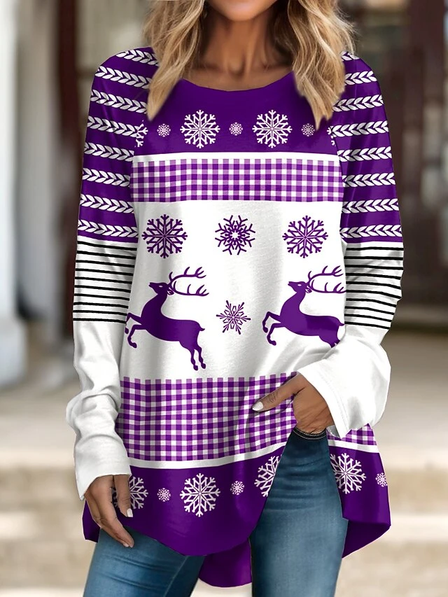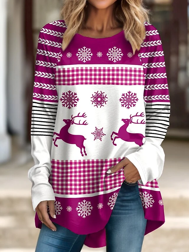 Women’s T Shirt Tee Christmas Shirt Pink Red Blue Plaid Snowflake Reindeer Print Long Sleeve Party Christmas Weekend Festival / Holiday Christmas Round Neck Regular Fit Painting Spring &Fall