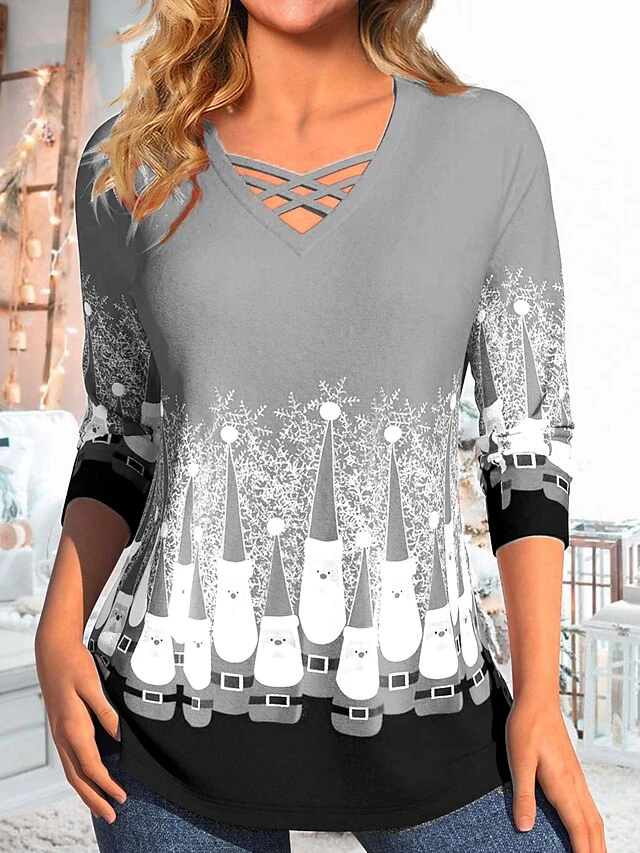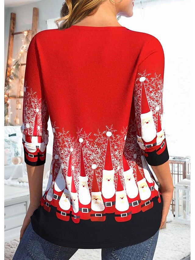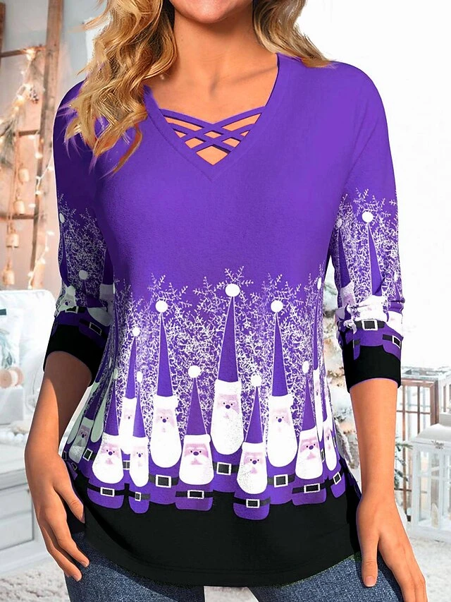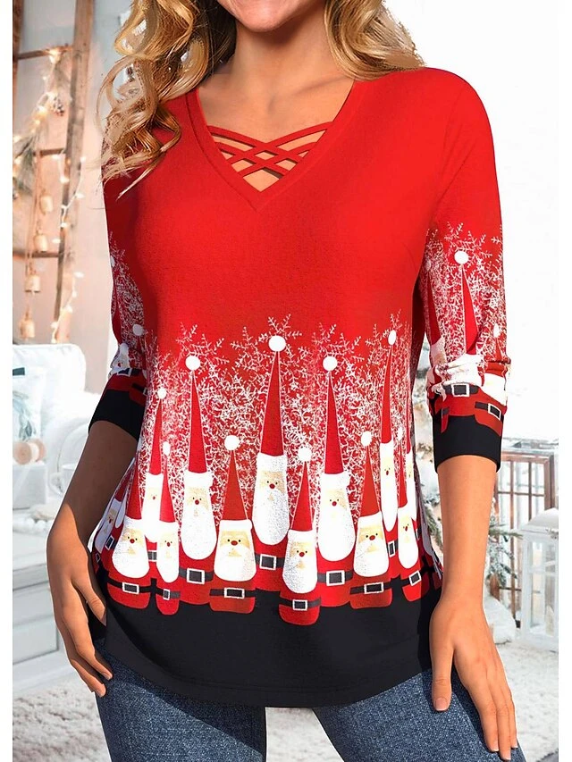 Women’s T Shirt Tee Christmas Shirt Pink Red Blue Santa Claus Print Long Sleeve Christmas Weekend Festival / Holiday Christmas V Neck Regular Fit Painting Spring &Fall