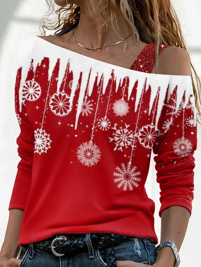Women’s T Shirt Tee Christmas Shirt Red Blue Green Snowflake Print Long Sleeve Christmas Weekend Basic Christmas Off Shoulder Regular Fit Painting Fall & Winter